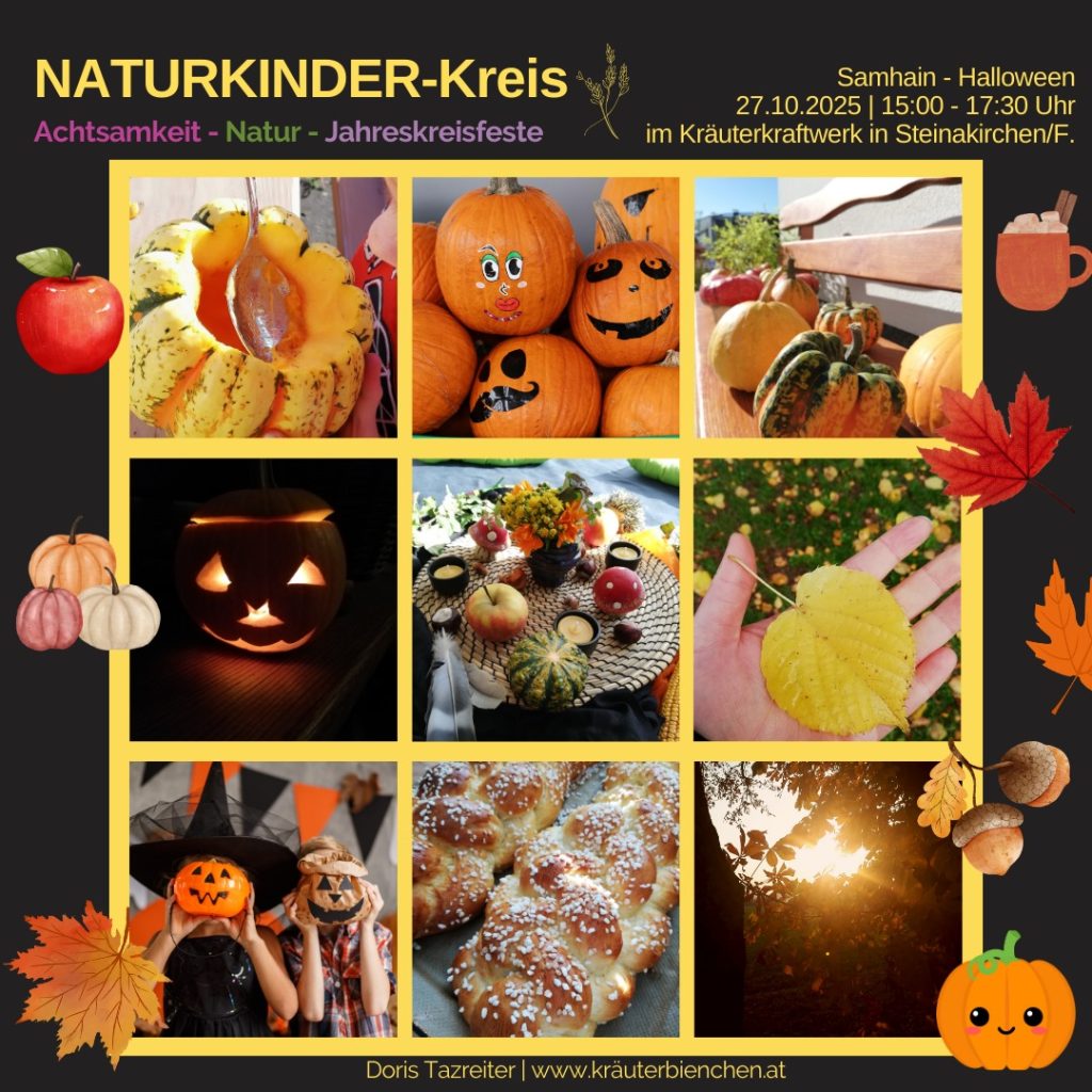 Jahreskreisfest für Kinder. Gemeinsam werden wir zu diesem Fest nochmals in die Magie des Herbstes eintauchen. Wir stellen eine Apfelstrudelsalbe her und gestalten ein Kürbisgesicht. Zum Abschluss gibt’s noch eine leckere Striezeljause
